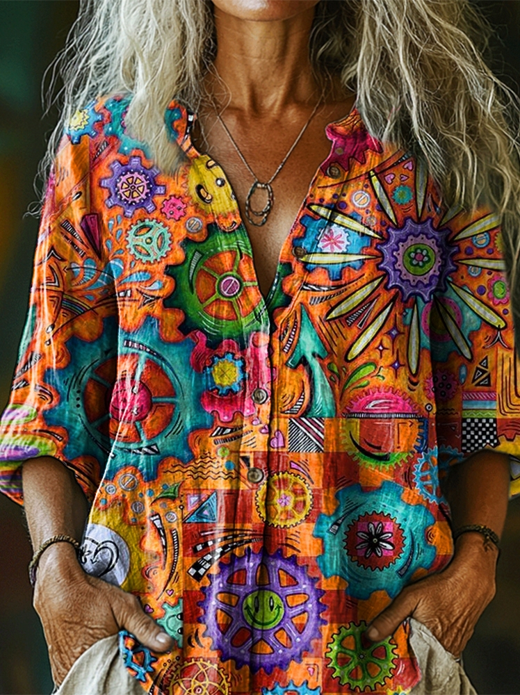 Women's Retro Colorful Patchwork Art Print Casual Cotton Linen Shirt