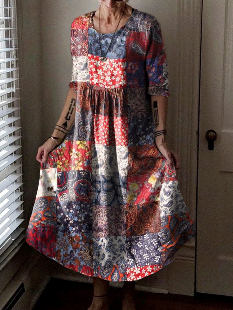 Women's Vintage Floral Patchwork Art Print Pocket Cotton Dress