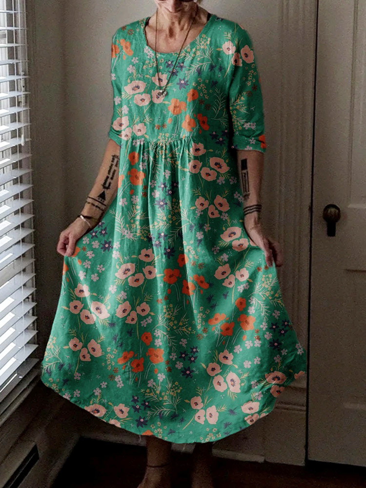 Women's Vintage Floral Art Print Pocket Cotton Dress