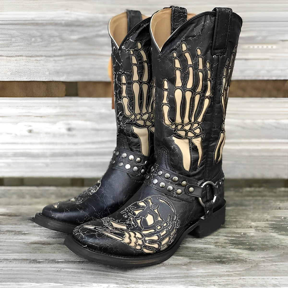 MEN'S VINTAGE SKULL BUCKLE BLACK BIKER BOOTS 90156410S