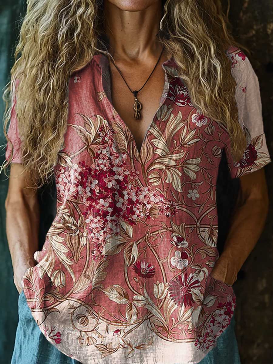 Women's Vintage Floral Art Print Short Sleeve Cotton and Linen Shirt