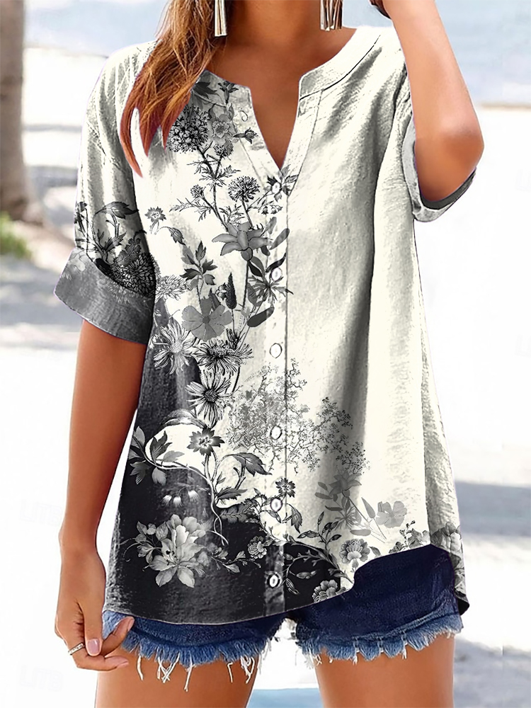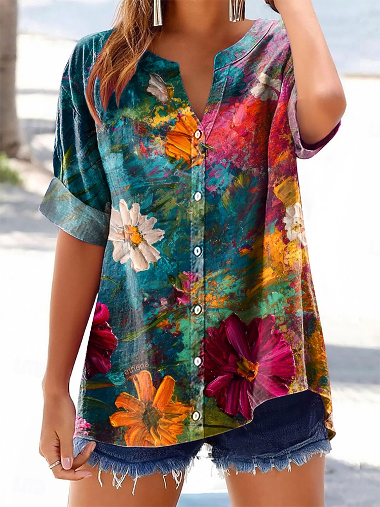 Women's Floral Pattern Art Print Casual Short Sleeve Comfortable Cotton Shirt