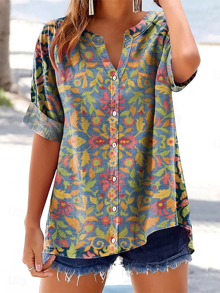 Women's Vintage Bohemian Floral Art Print Casual Short Sleeve Comfortable Cotton Shirt