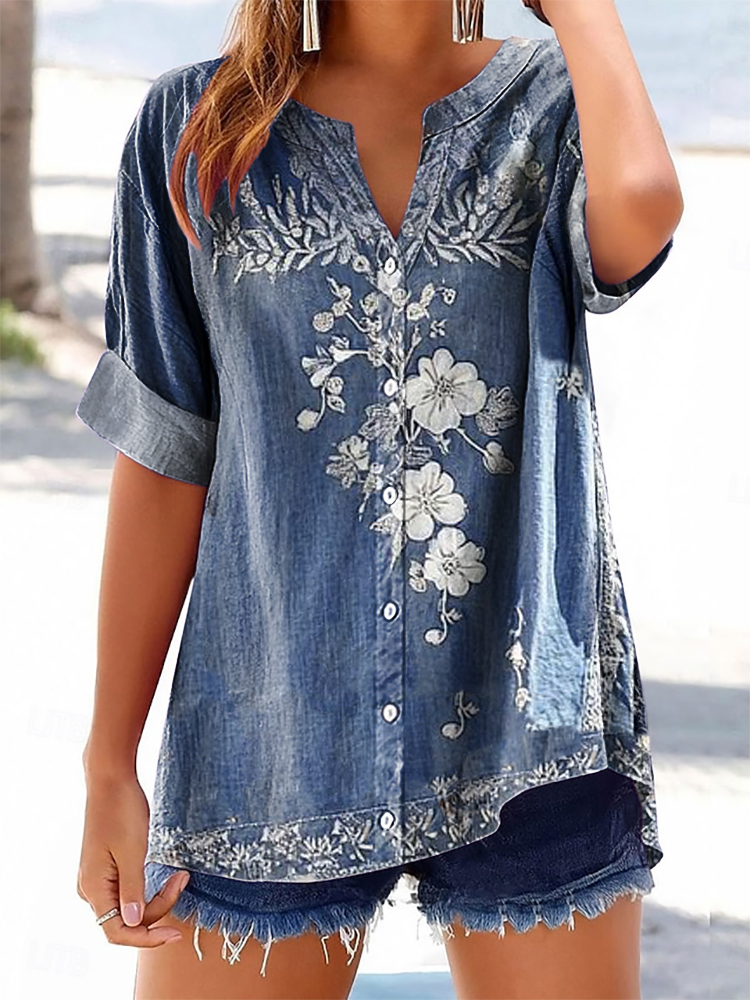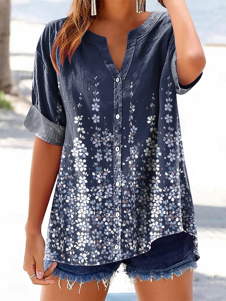 Women's Bohemian Flower Art Print Casual Short Sleeve Cotton and Linen Shirt
