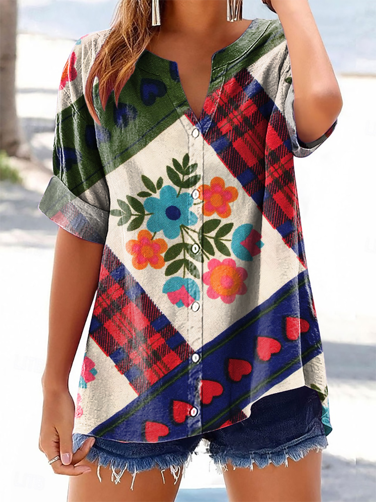 Women's Vintage Floral Patchwork Art Print Casual Short Sleeve Comfortable Cotton Shirt