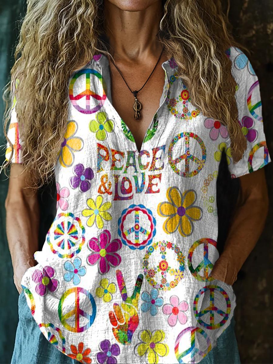 Women's Hippie Peace Love Art Print Casual Cotton And Linen Shirt