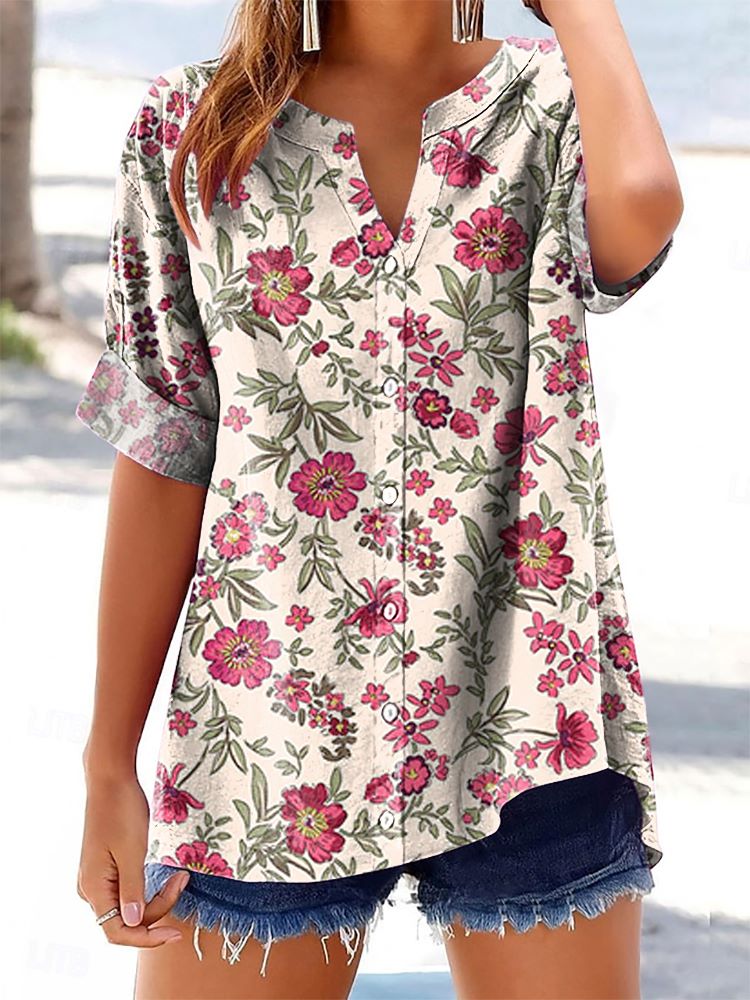 Women's Ethnic Flower Art Print Casual Cotton And Linen Short Sleeve Shirt