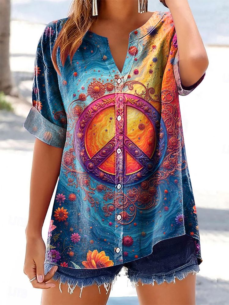 Women's Love Peace Hippie Pattern Art Print Cotton Linen Casual Shirt
