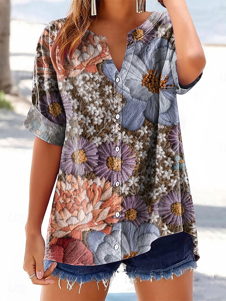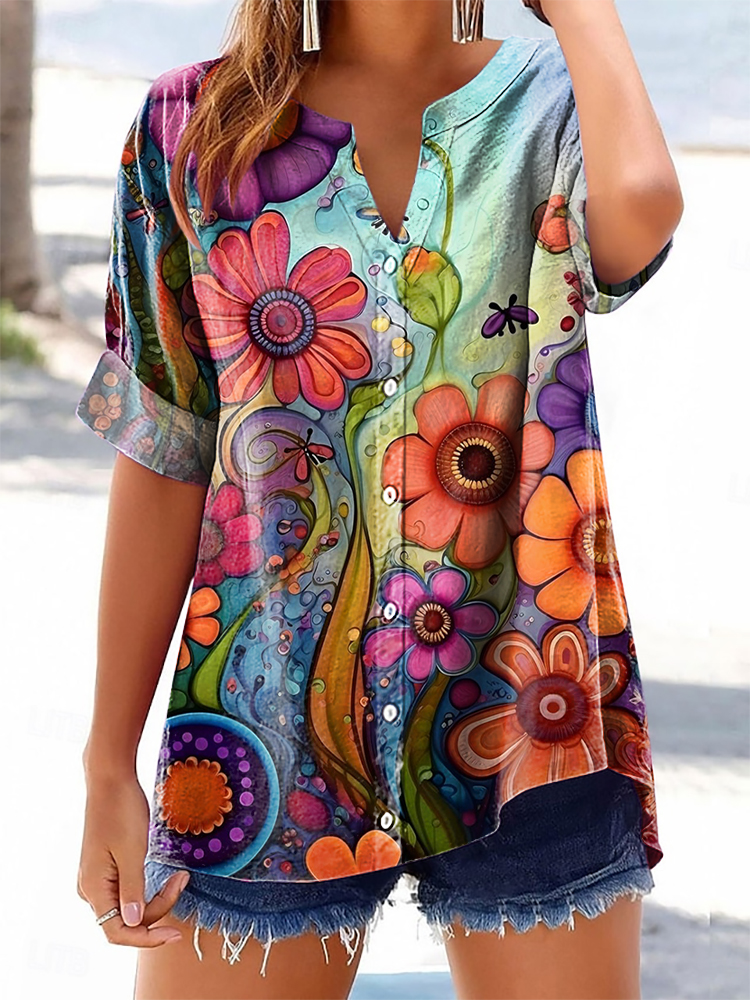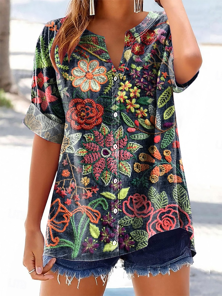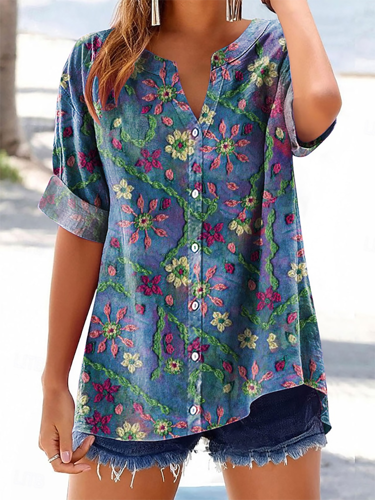 Women's Colorful Floral Art Print Casual Cotton And Linen Shirt