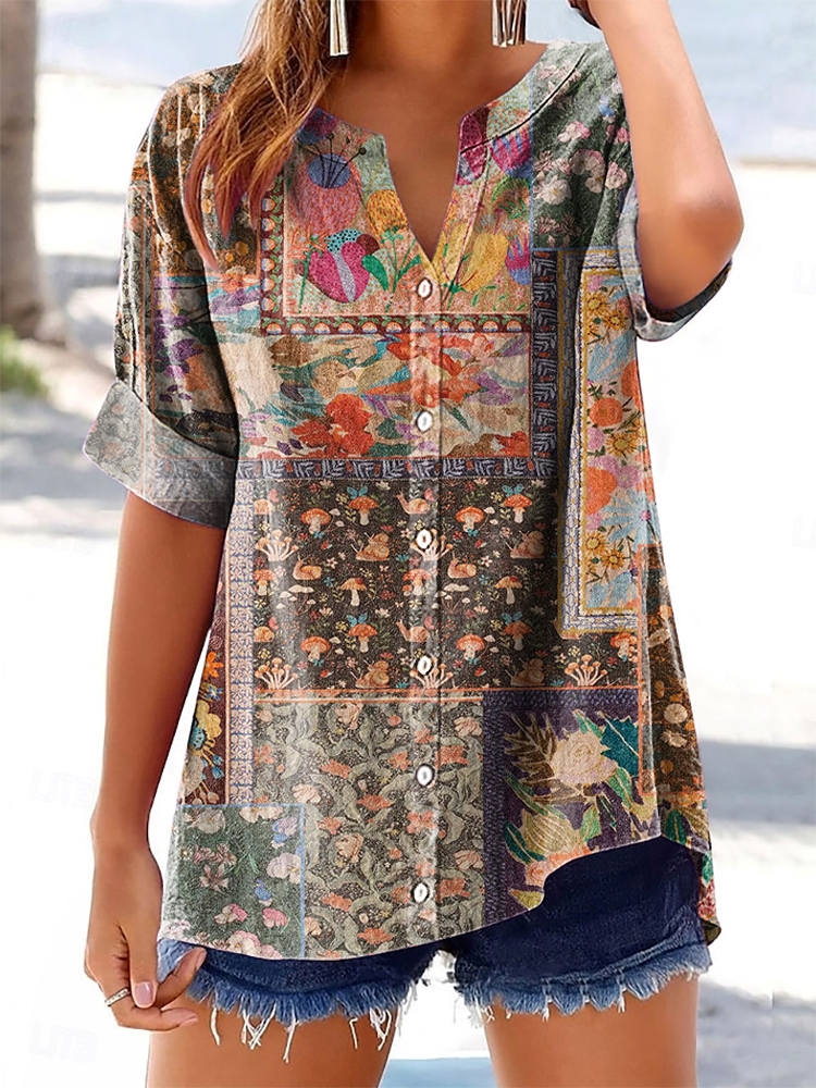 Women's Vintage Bohemian Floral Art Print Casual Cotton And Linen Shirt