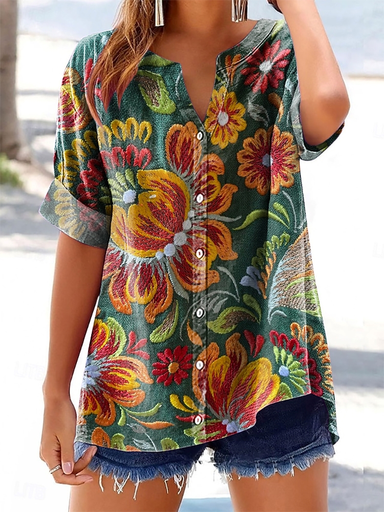 Women's Floral Pattern Art Print Cotton Linen Casual Shirt