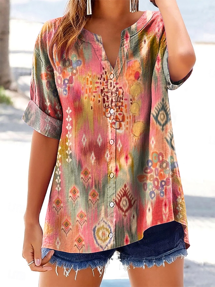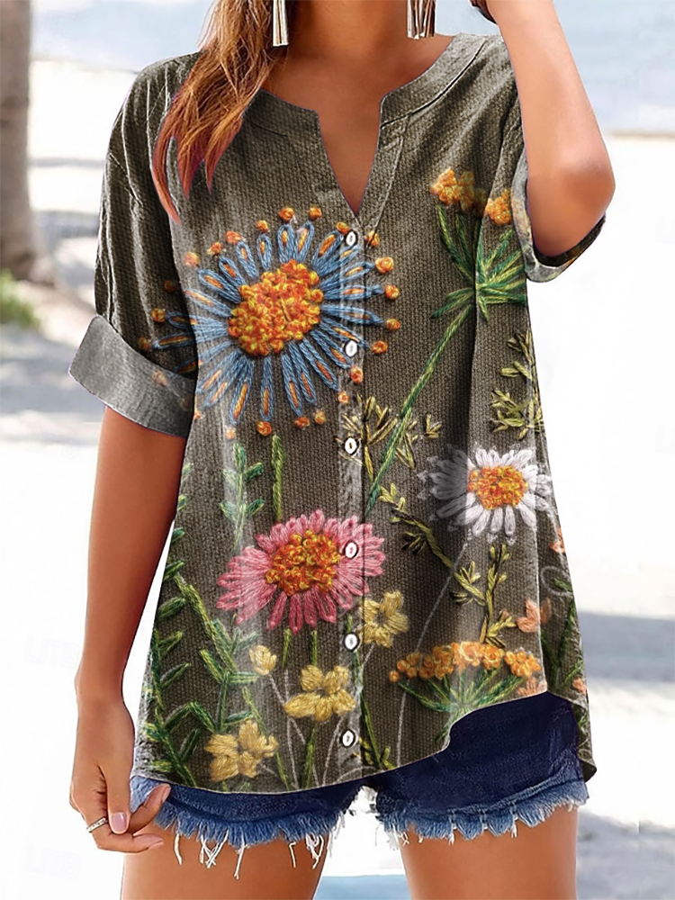 Women's Bohemian Flower Art Print Casual Short Sleeve Cotton and Linen Shirt