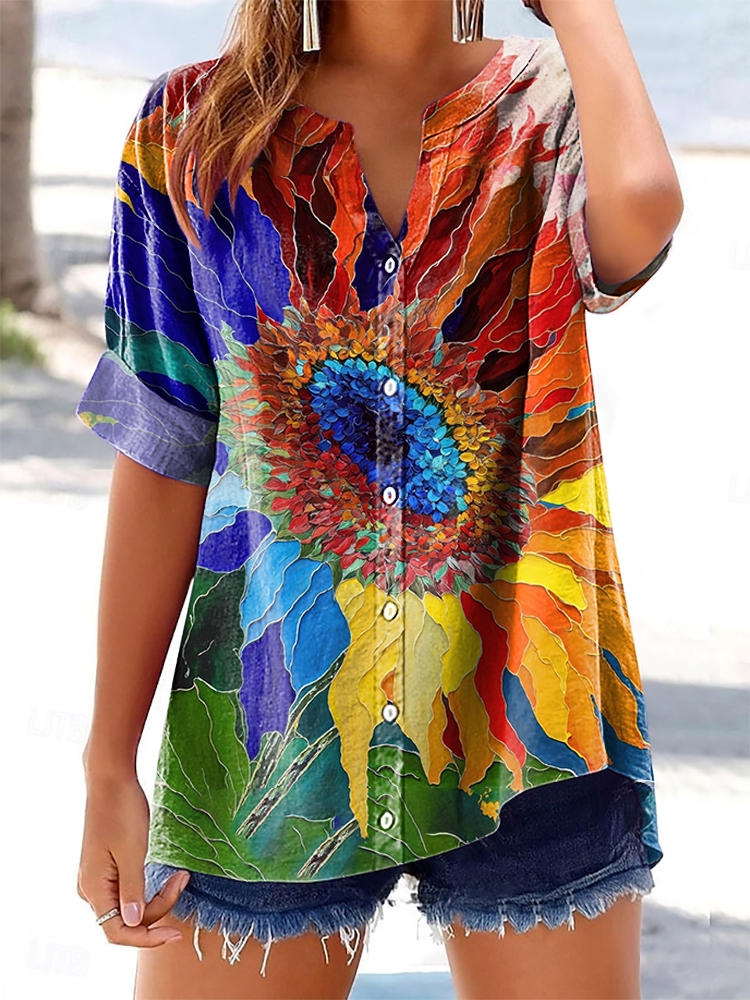 Women's Colorful Sunflower Pattern Art Print Casual Cotton Linen Short Sleeve Shirt
