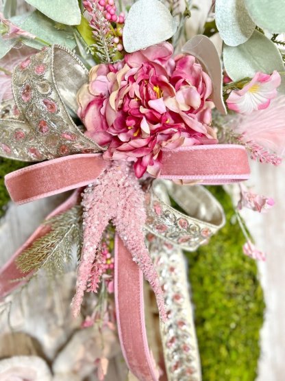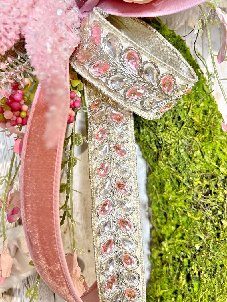 This elegant and gorgeous moss wreath is adorned with dazzling details! From the sweet lavish bunny perched in a nest of flirty florals, to the designer velvet and jeweled ribbons and curls.