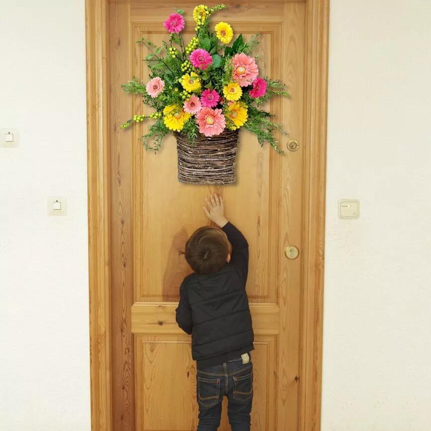 Gerbera daisy door basket decoration on the front door. This gerbera daisy door basket is very hospitable. You will fall in love with it at the front door! Your friends will be surprised by your decoration! Because they have never seen such a wreath! This will open a new chapter in your circle of friends, you will lead a new trend!