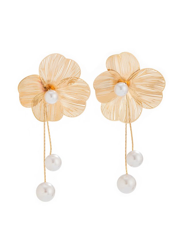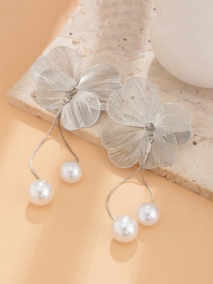 1pair Elegant Hollow Out Flower Imitation Pearl Tassel Earrings