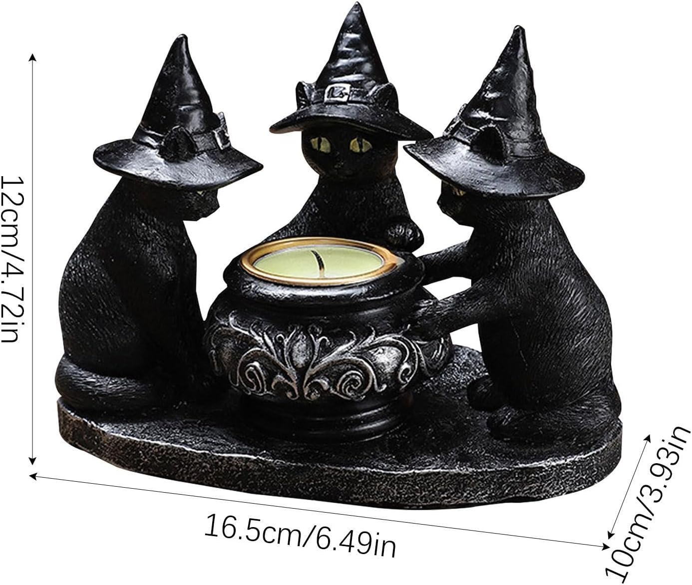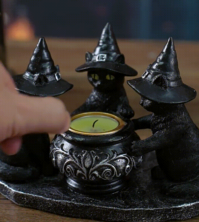 In the mysterious atmosphere of Halloween, this magic black cat candle holder is definitely your best choice. Three black cats wearing pointed wizard hats gather around an exquisitely carved magic crucible, as if they are conducting a mysterious magic ritual. When the candlelight flickers in the crucible, the eyes of the black cats seem to glow with strange light, instantly bringing you into a fantasy magic world.