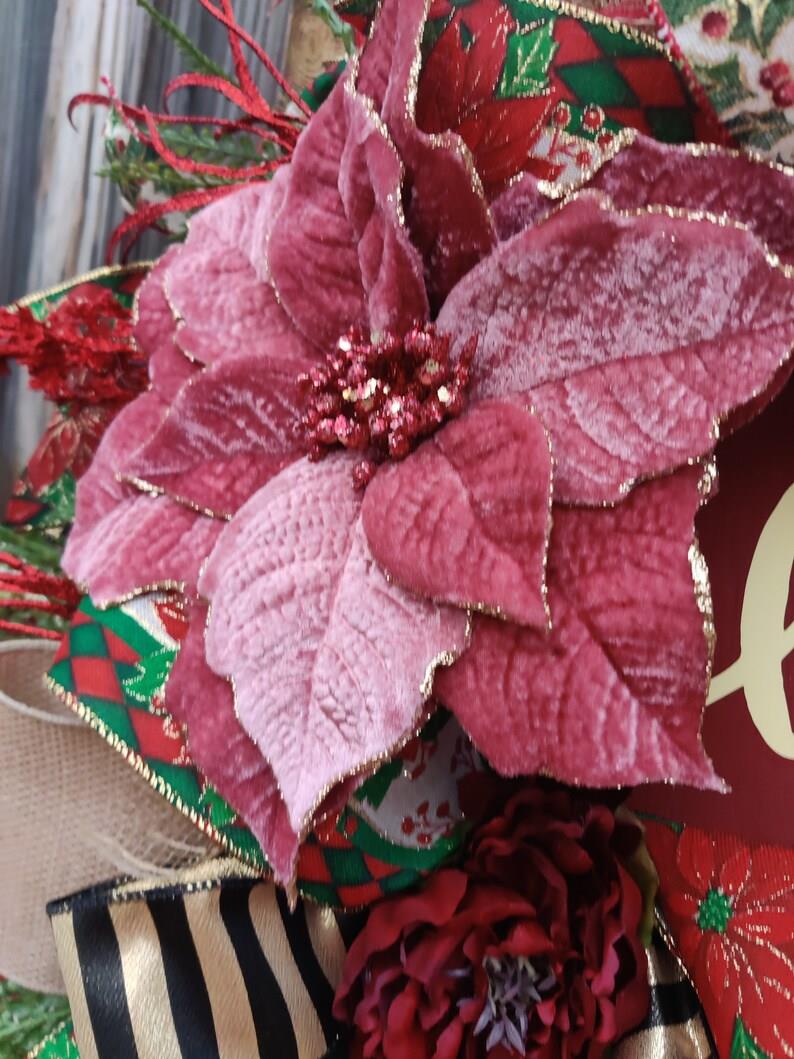 I began this arrangement on a thick and lush evergreen wreath base (faux of course). I hand tied a stunning double bow with a 4” wide high end elaborate designer ribbon that is just to drool over.