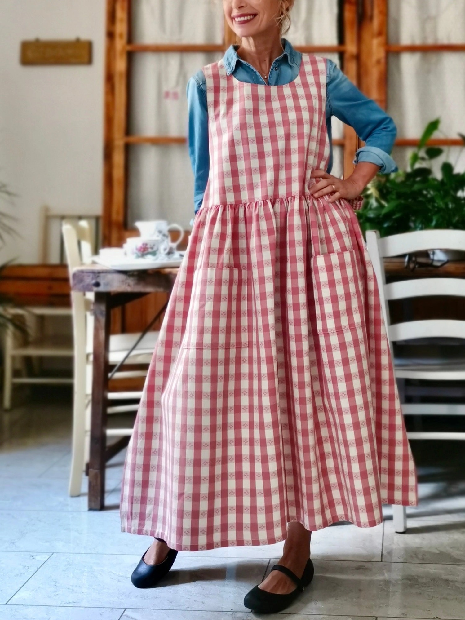 This exquisite Antique Pink Checked Apron with Embroidered Flowers represents a perfect blend of vintage charm and functional design, crafted for the discerning home cook who appreciates both style and practicality. The delicate antique pink checked pattern evokes nostalgic memories of traditional American kitchens while maintaining contemporary appeal, making it an ideal choice for modern culinary enthusiasts who value timeless elegance. The intricate embroidered floral motifs are meticulously hand-stitched with precision, showcasing superior craftsmanship and attention to detail that ensures durability and long-lasting beauty. Constructed from high-quality, fade-resistant fabric, this apron provides excellent protection against spills and stains while maintaining its vibrant coloration through countless washing cycles. The thoughtfully designed full-coverage style features adjustable neck and waist ties that accommodate various body types, ensuring a comfortable and secure fit during extended cooking sessions. Whether you're preparing a family dinner, hosting a holiday gathering, or engaging in serious baking endeavors, this professionally-grade apron combines practical functionality with sophisticated aesthetic appeal, making it an essential addition to any well-equipped kitchen and an excellent gift choice for culinary professionals and passionate home cooks alike.