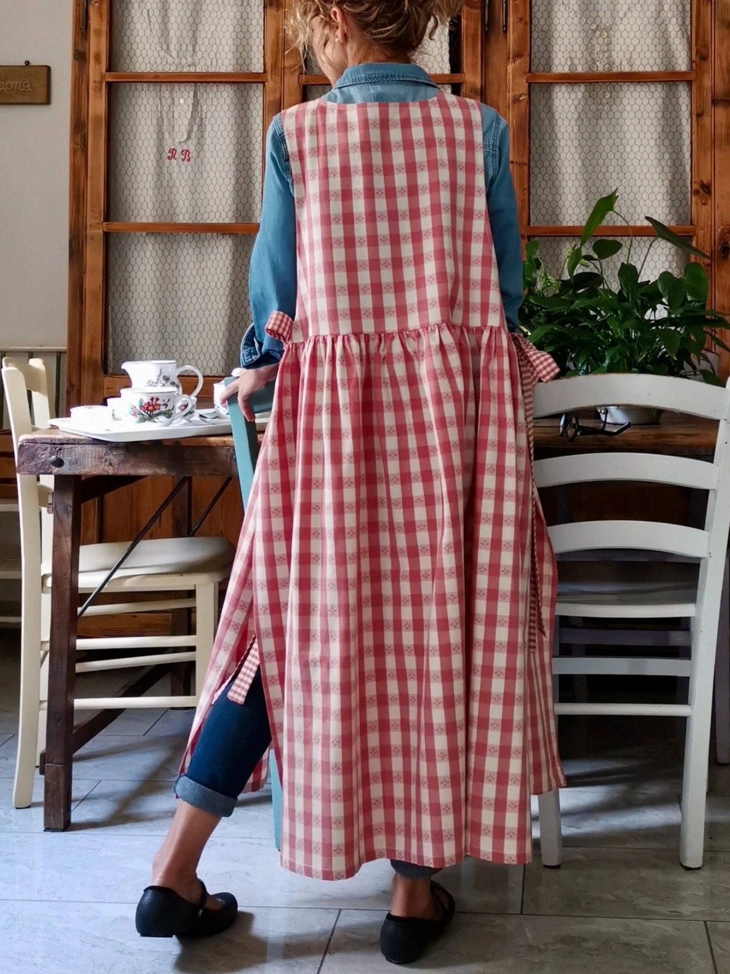 Antique Pink Checked Apron with Embroidered Flowers