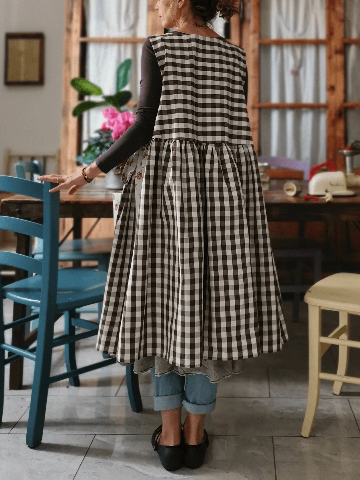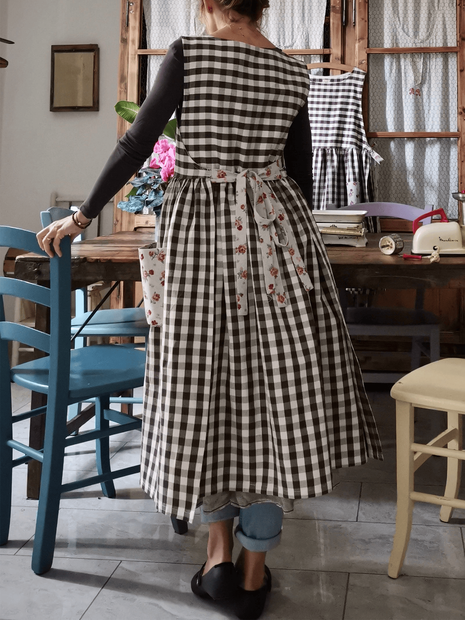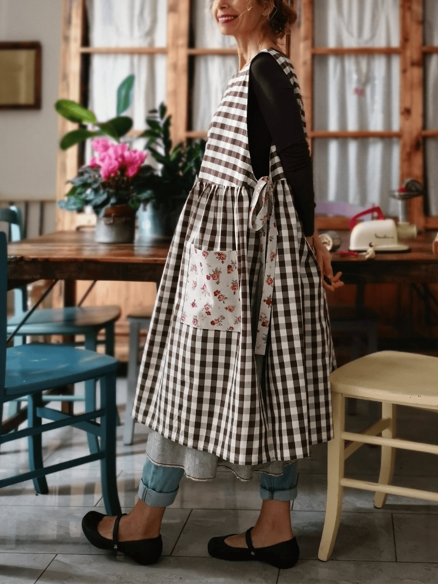 The Floral-Pocket Brown Checkered Apron combines traditional functionality with contemporary style, featuring a classic brown checkered pattern that provides versatile coordination with various kitchen décor themes. This professionally crafted apron incorporates strategically placed pockets adorned with delicate floral accents, offering both practical storage solutions for cooking utensils and recipe cards while maintaining an aesthetically pleasing appearance. Constructed from durable, easy-care fabric that withstands frequent washing and daily kitchen activities, this apron delivers reliable protection against spills, splatters, and stains during food preparation, cooking, and baking tasks. The thoughtfully designed brown checkered base creates a timeless appeal suitable for both casual home cooking and more formal culinary presentations, while the floral pocket detailing adds a sophisticated touch that appeals to discerning home chefs and culinary enthusiasts. Featuring adjustable neck and waist ties for customizable fit and comfort during extended wear, this apron accommodates various body types and cooking preferences, making it an essential addition to any well-equipped kitchen and an excellent gift choice for cooking enthusiasts, professional chefs, or anyone who appreciates quality kitchen accessories that blend practical functionality with refined design elements.