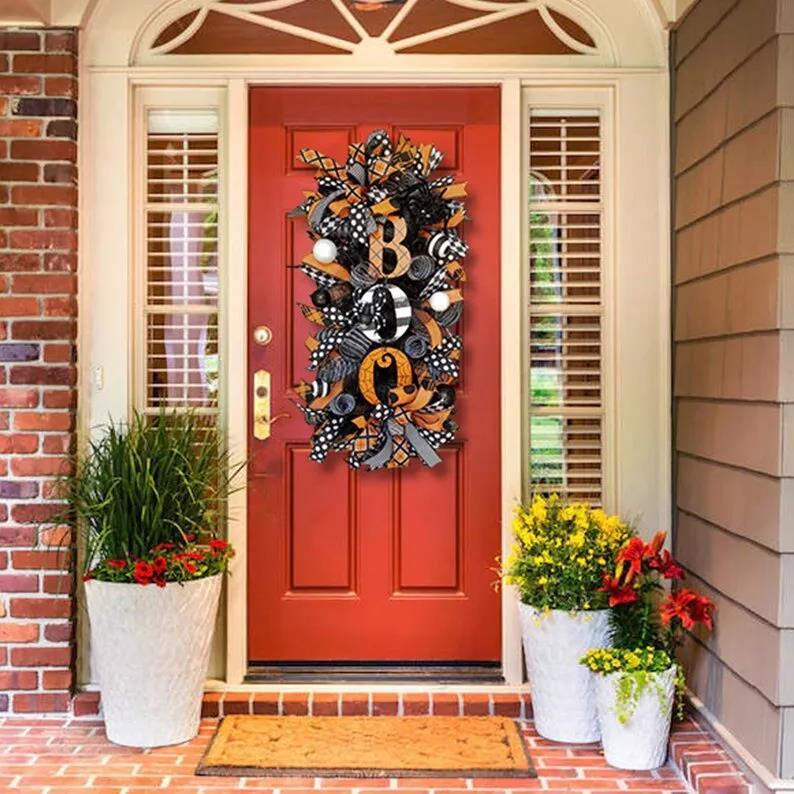 The swag wreath features a spooky BOO with a spider on it. There are several types of mesh and ribbons that together help give that amazing Halloween look. There is a spider on the top. There are several glitter ball picks throughout. It is finished off with 2 gorgeous full bows, one on the top and one on bottom.