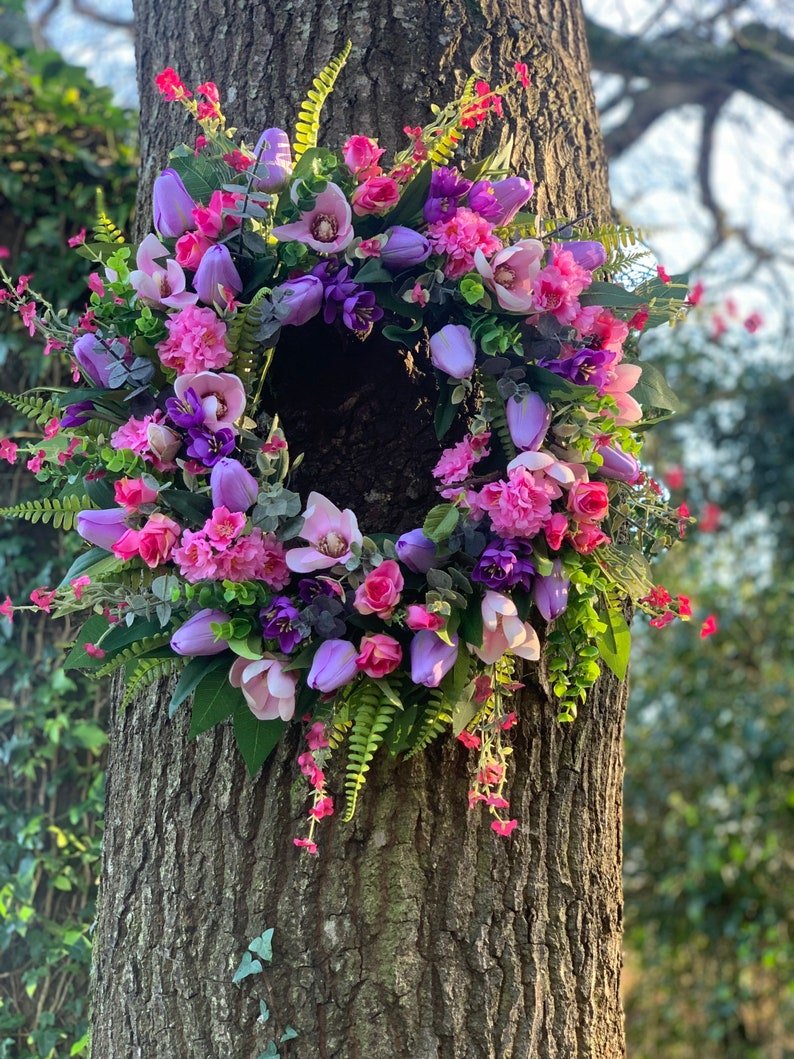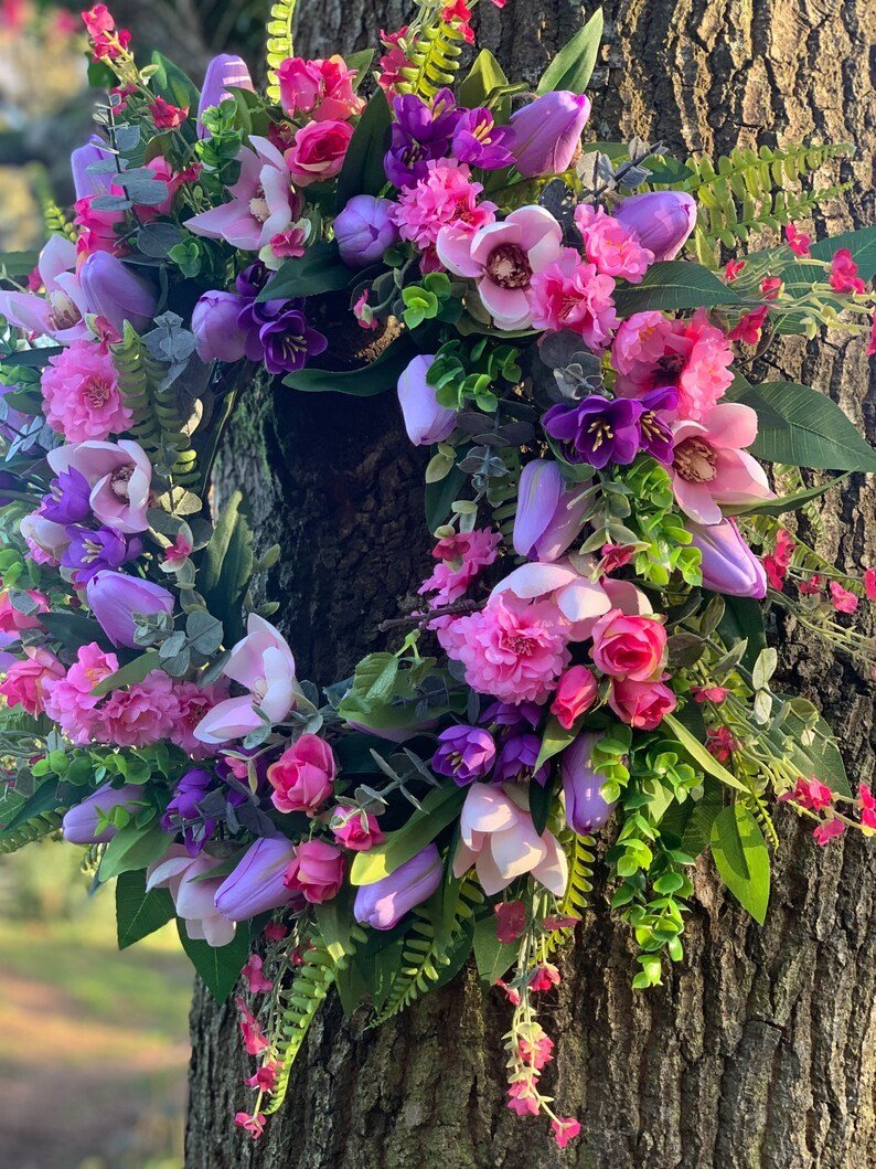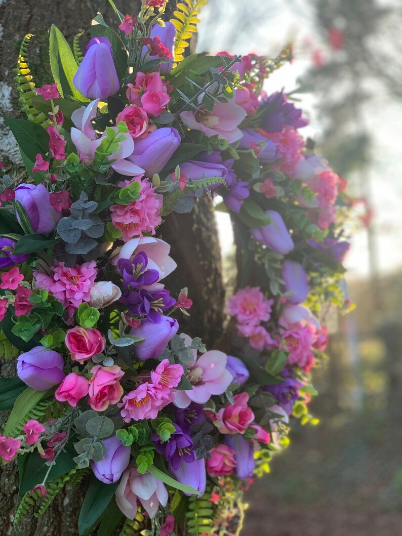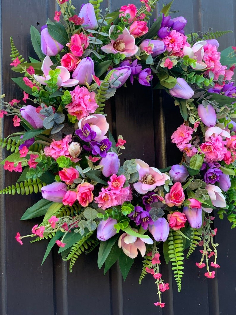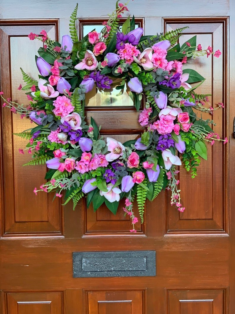 Handmade spring faux flower door wreath in pinks, purples and green.