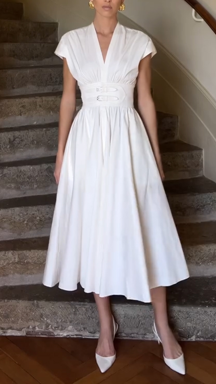 For those who cherish timeless elegance and appreciate the beauty of simplicity, this white V - neck midi dress is an absolute must - have. Its classic silhouette, combined with modern accents, captures the essence of refined fashion. Whether you're a bride - to - be searching for the perfect rehearsal dinner dress or someone who simply loves to look effortlessly chic, this dress is the answer.