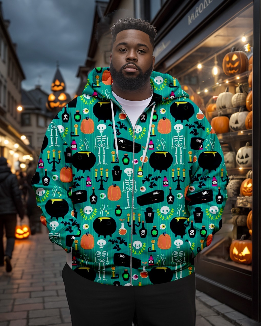 Men's Plus Size Halloween Pumpkin Witch Bat Skull Zip-Up Hoodie 006