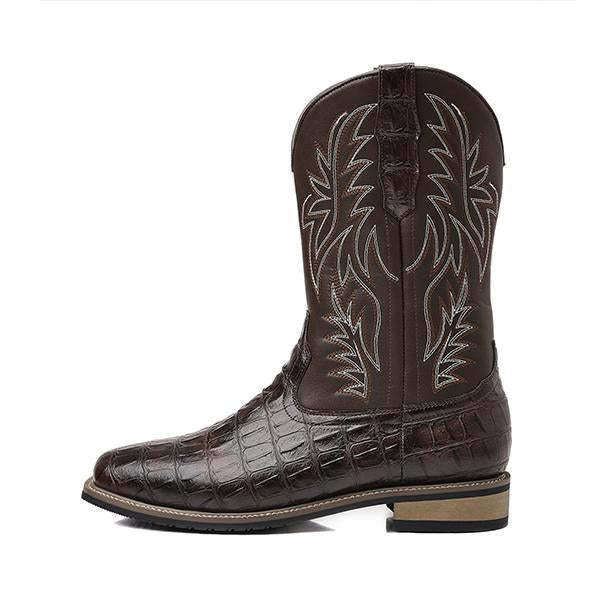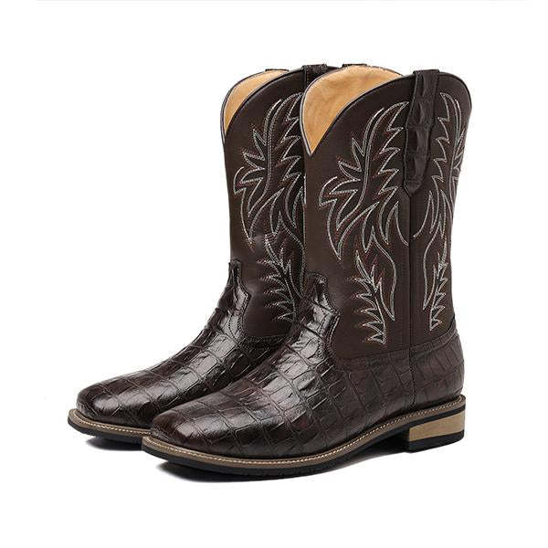 MEN'S VINTAGE STONE EMBROIDERED COWBOY BOOTS are a unique blend of classic Western style and intricate craftsmanship, offering a bold statement of individuality and vintage charm. These boots typically feature a timeless cowboy silhouette with a pointed toe, sturdy heel, and durable outsole, all of which contribute to their rugged yet stylish look. The standout feature of this particular design is the stone-inspired texture, often seen in the form of detailed etchings or embossing on the leather, which creates a visually striking pattern reminiscent of natural stone formations. This gives the boots a distinctive, hand-crafted feel that sets them apart from more mass-produced styles. In addition to the stone detailing, the boots are usually adorned with beautiful embroidered patterns. The embroidery often features intricate motifs such as floral designs, animals, or other Western symbols, adding a touch of artistry and personality to the piece. This hand-stitched embroidery not only enhances the visual appeal but also speaks to the time and skill invested in making each pair. The materials used are typically high-quality leather, often cowhide or sometimes even exotic leathers, which age beautifully and develop a unique patina over time. Comfort is another key aspect of these boots, with many featuring a cushioned insole and well-designed arch support to ensure they’re comfortable for long wear. The outsoles are typically made from rubber or leather, providing a solid grip and durability, whether you're wearing them for a day of work or a night out. These boots are not just about style—they are crafted for functionality and longevity as well. Thanks to their versatile design, MEN'S VINTAGE STONE EMBROIDERED COWBOY BOOTS can be paired with a wide range of outfits. They look great with jeans, chinos, or even a tailored suit, allowing wearers to seamlessly integrate them into both casual and more polished looks. The combination of rugged Western elements and artistic details makes these boots a standout accessory for anyone who values both fashion and craftsmanship. Whether you're a cowboy at heart or simply someone who appreciates a unique, quality pair of boots, these vintage stone embroidered cowboy boots make a powerful statement of style and individuality.