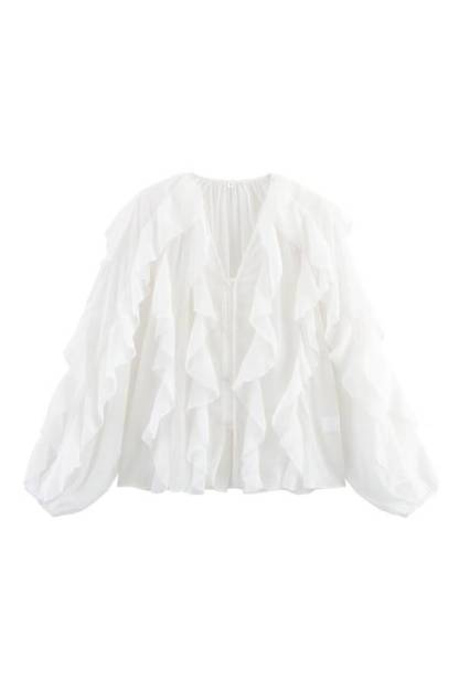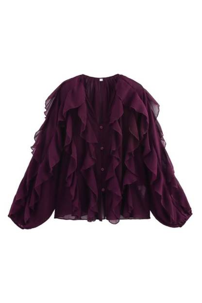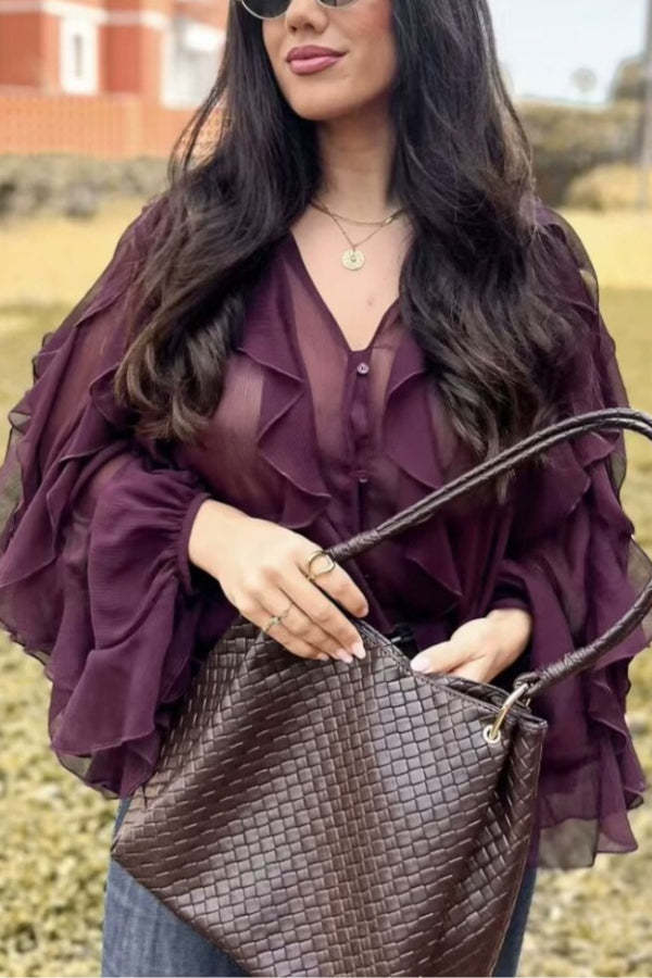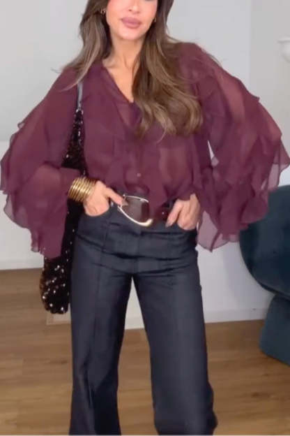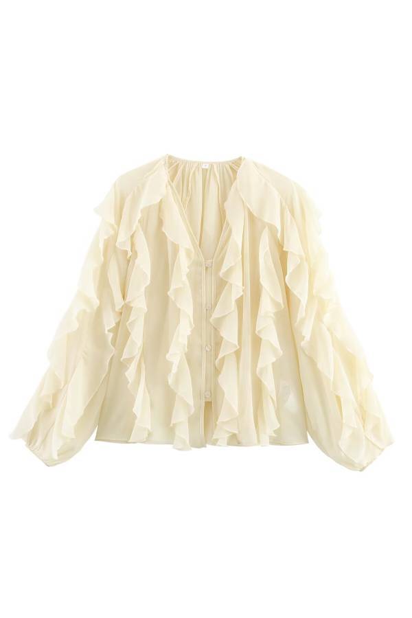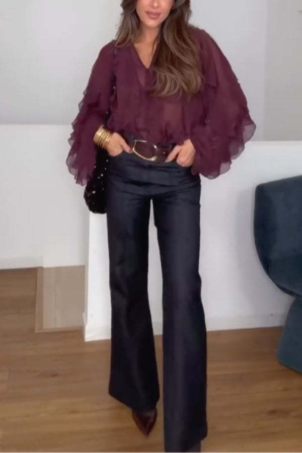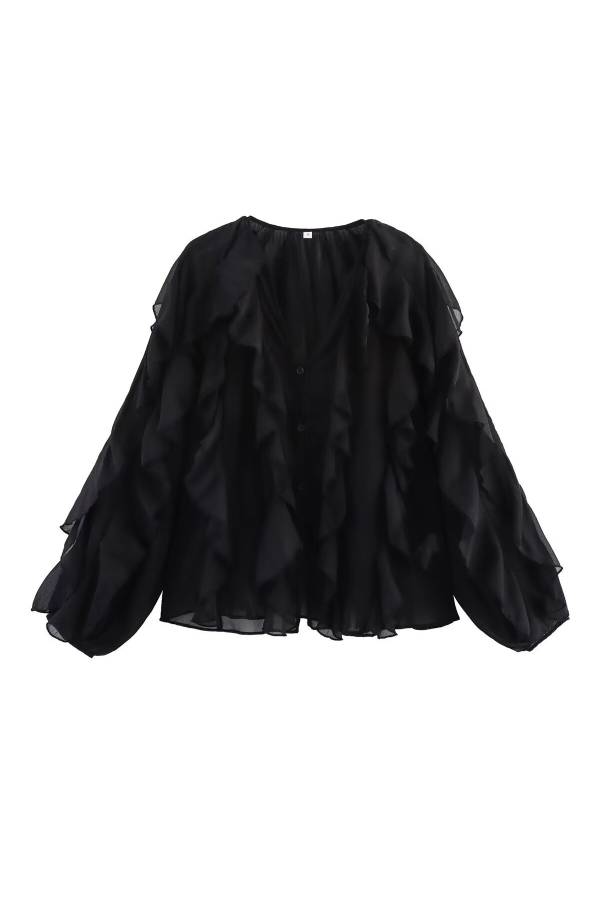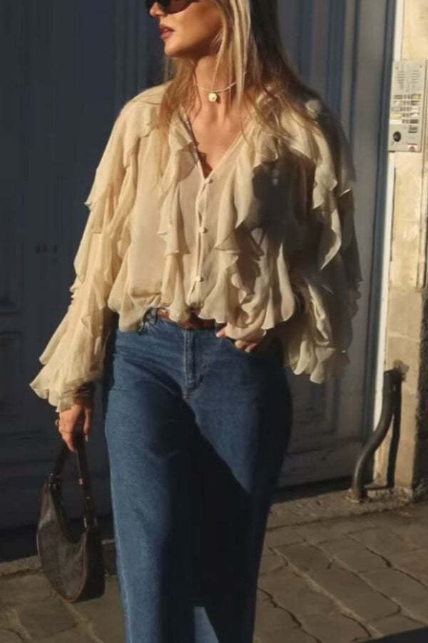 V-Neck Multi-Layer Ruffle Chiffon Lantern Sleeve Blouse