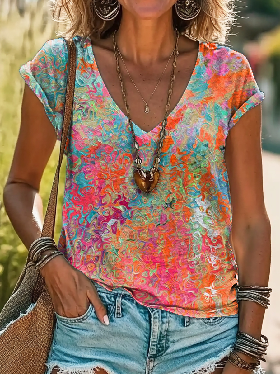 Vintage Floral Art Print 100%Cotton V-neck T-Shirt