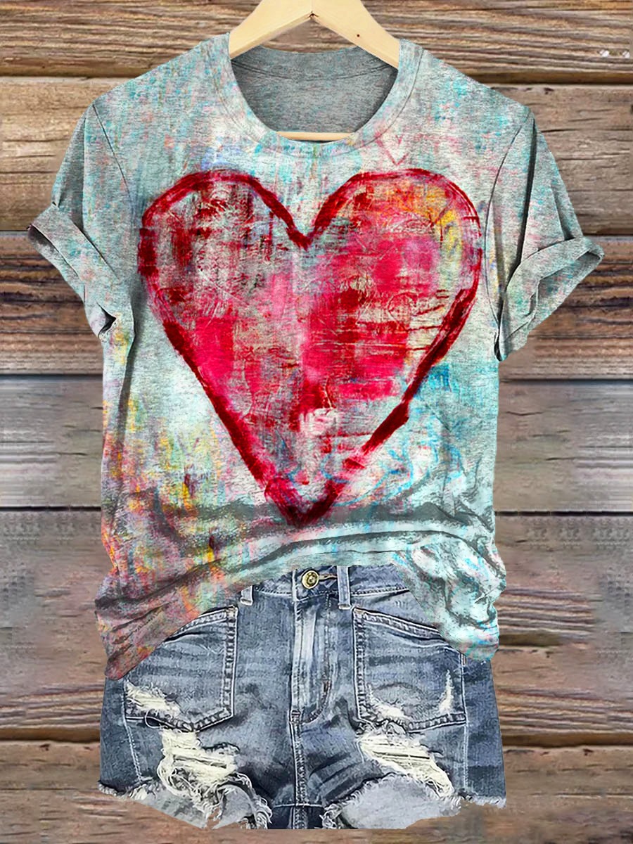 Vintage Graffiti Heart Art Pattern Print Crew Neck T-shirt