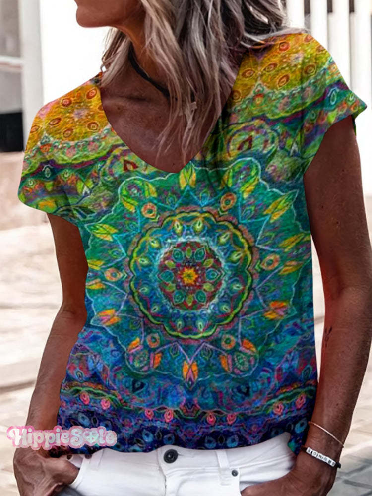 Vintage Mandala Print Women's V-neck Casual T-Shirt