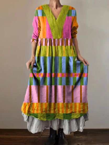 Women's Abstract Geometry Art Print V-Neck Button Pocket Cotton Dress