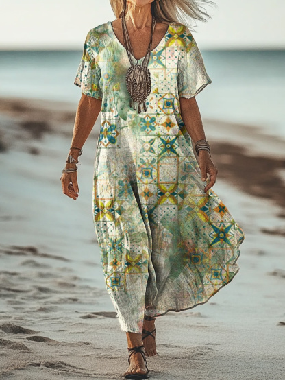 Women's Art Floral Hippie Vintage Print V Neck Dress