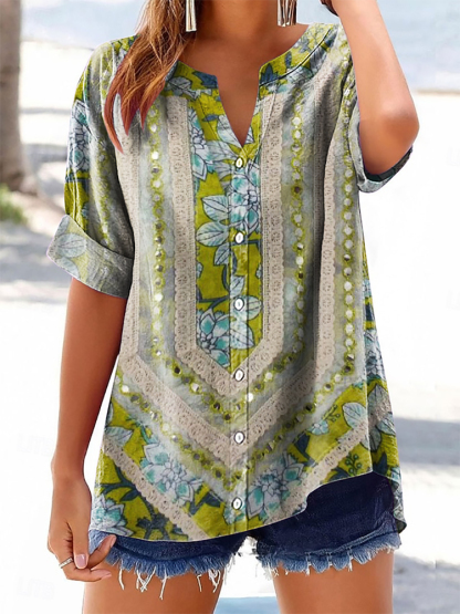 Women's Bohemian Floral Art Print Casual Cotton And Linen Shirt