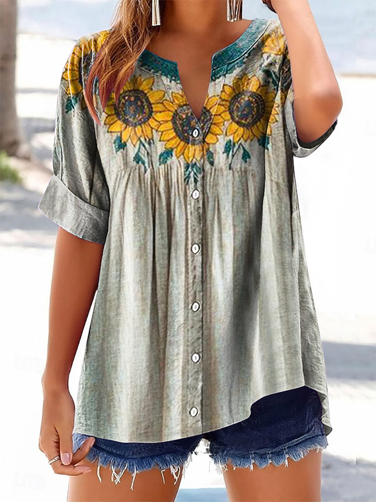 Women's Bohemian Floral Art Print Casual Cotton And Linen Shirt