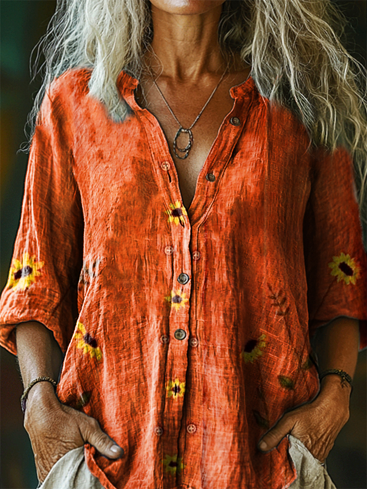 Women's Bohemian Floral Art Print Casual Cotton Linen Shirt