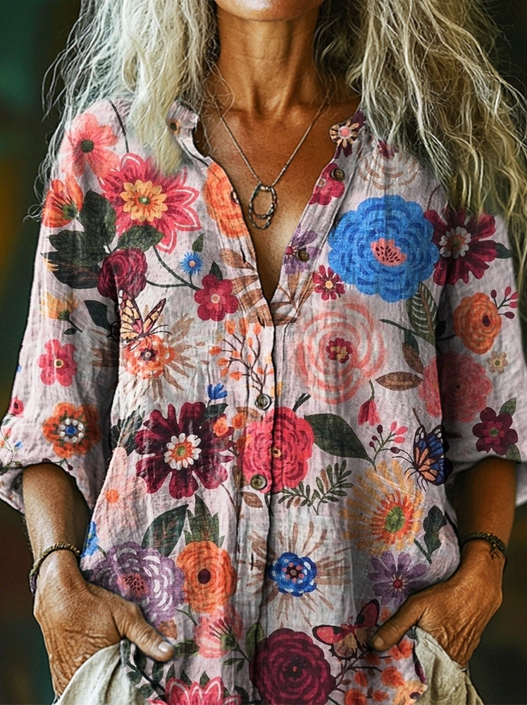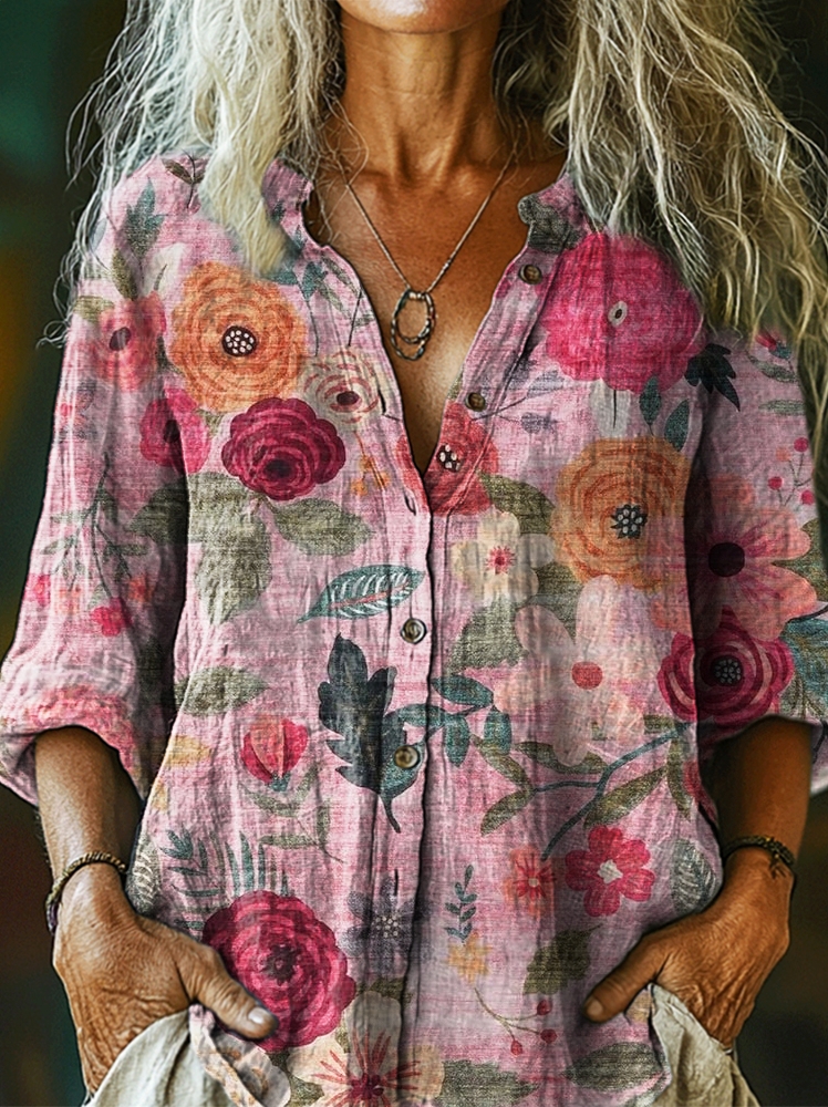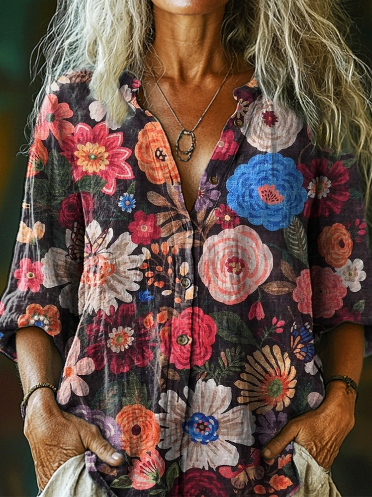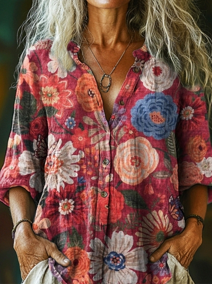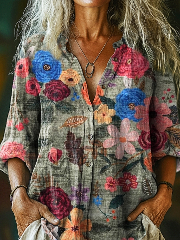 Women's Bohemian Flower Art Print Casual Cotton Linen Shirt