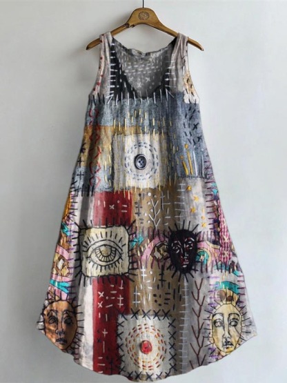 Women's Bohemian Patchwork Print V-neck Pocket Cotton Dress