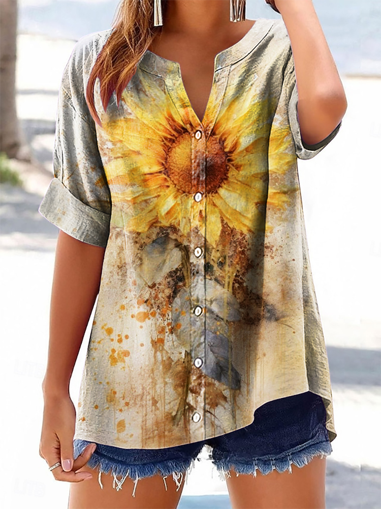 Women's Bohemian Sunfloral Art Print Casual Cotton And Linen Shirt