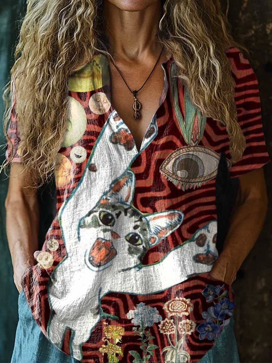 Women's Cat Ripple Pattern Art Print Casual Short Sleeve Comfortable Cotton Shirt