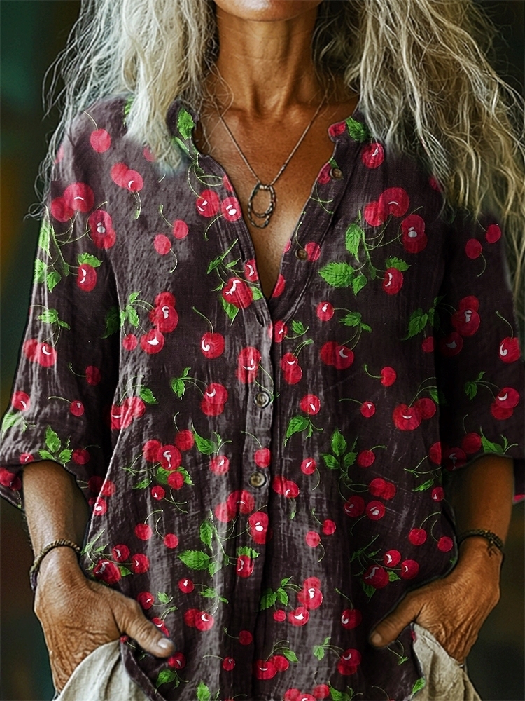 Women's Cherry Pattern Art Print Casual Cotton Linen Shirt