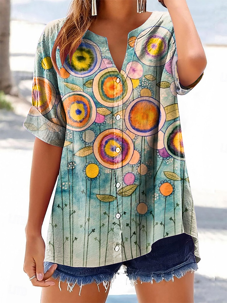 Women's Colorful Abstract Floral Pattern Art Print Cotton Linen Casual Shirt