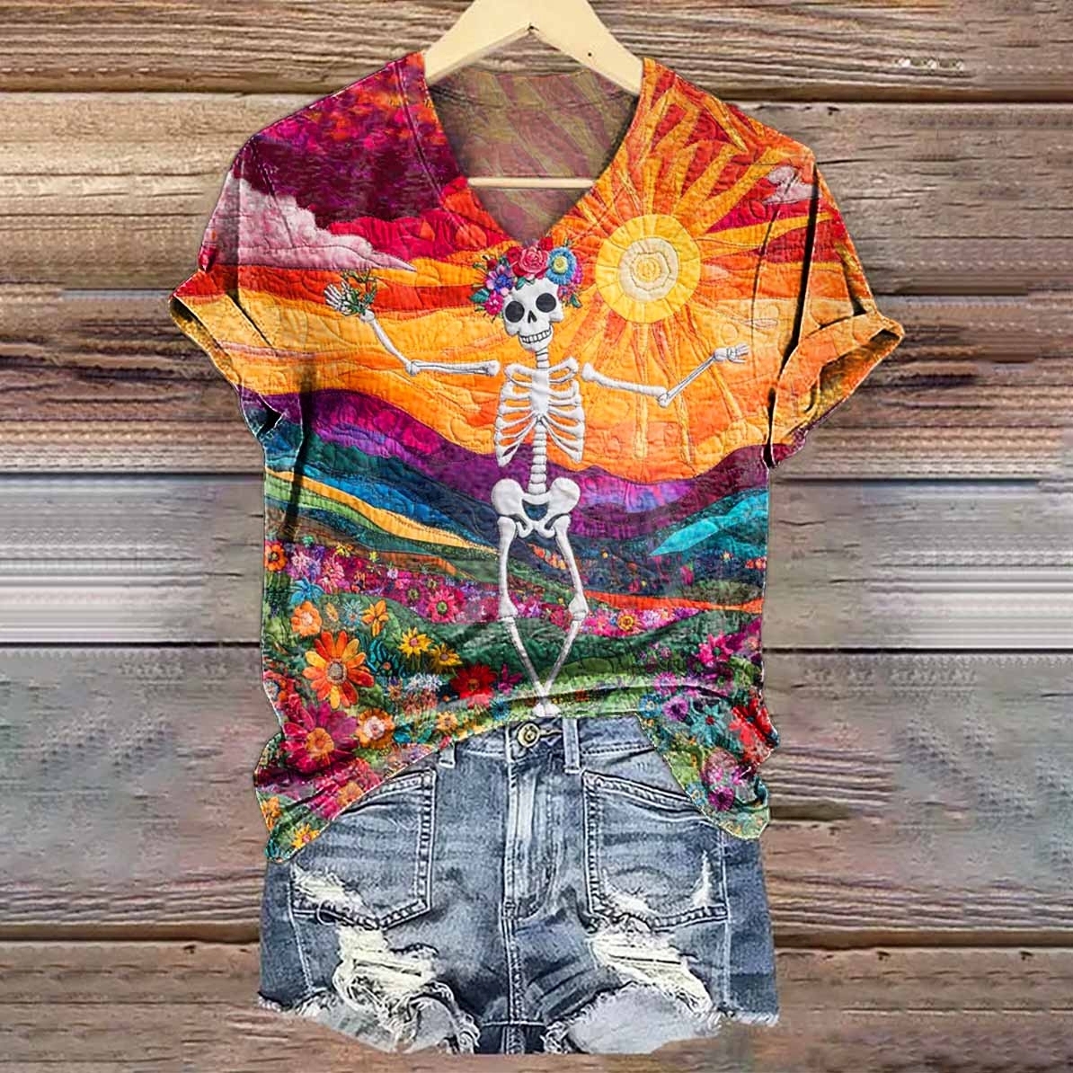 Women's Colorful Dancing Skull Print V-Neck Casual T-Shirt