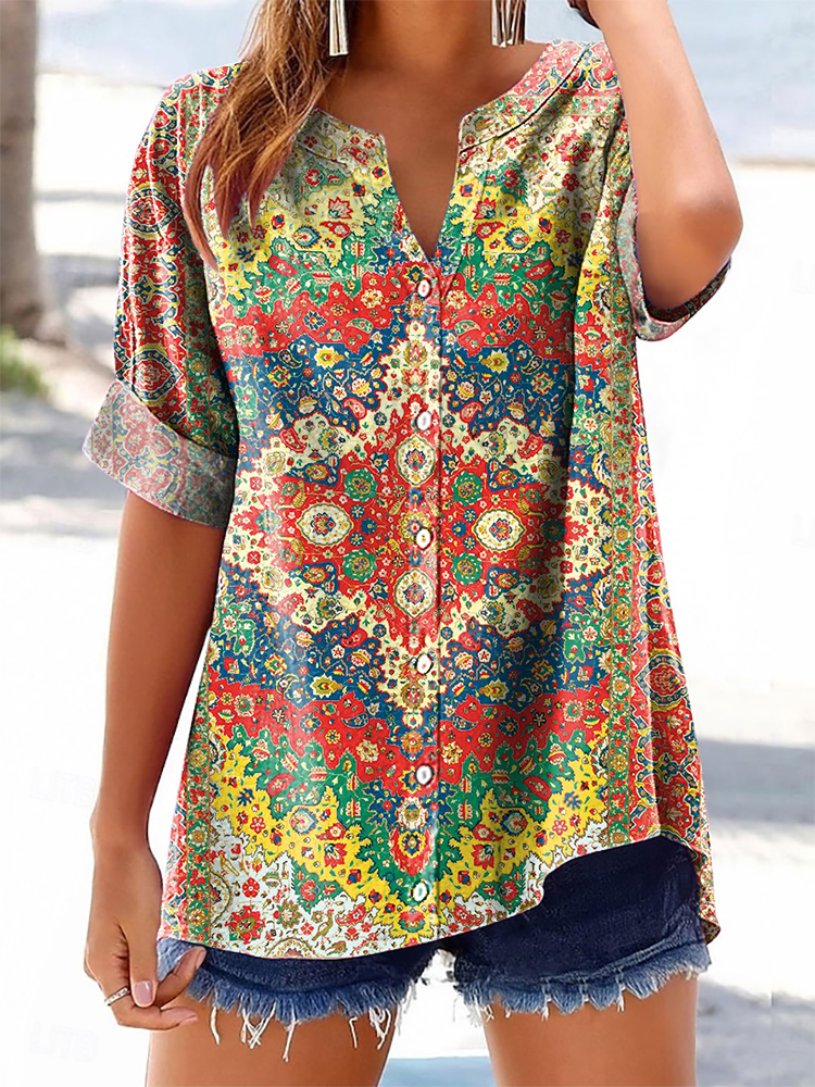 Women's Colorful Ethnic Totem Flower Art Print Casual Cotton And Linen Shirt