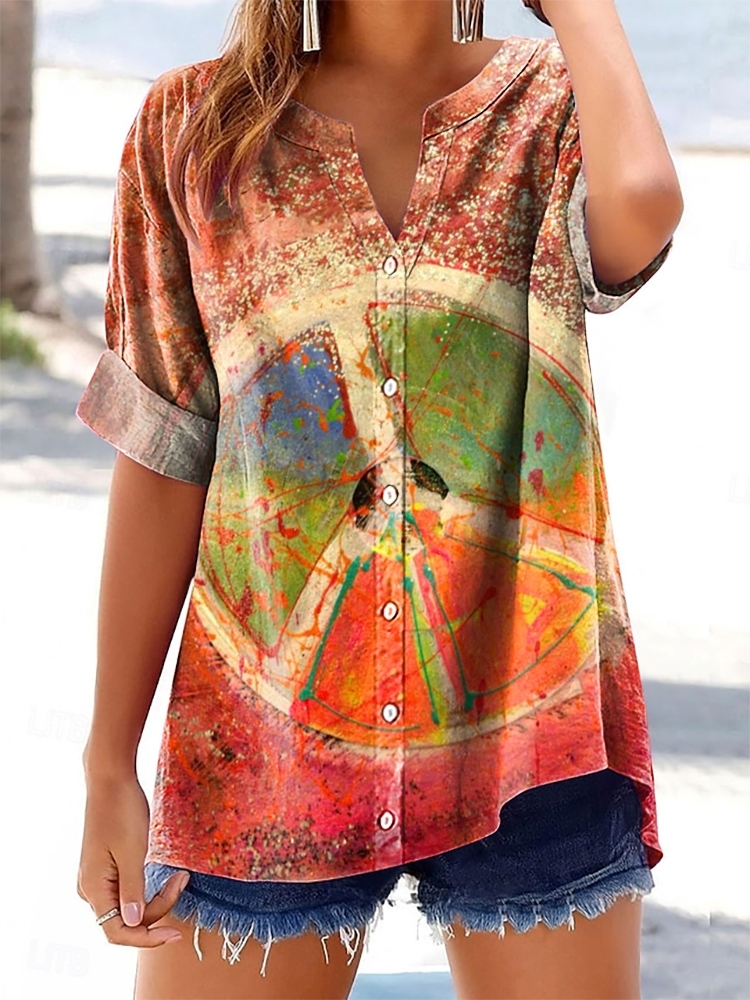 Women's Colorful Hippie Peace Print Casual Cotton And Linen Short Sleeve Shirt