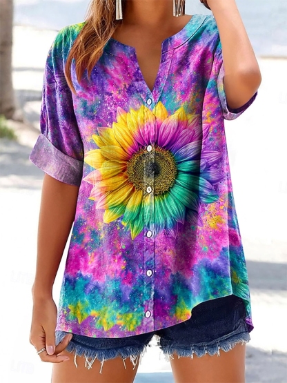 Women's Colorful Tie-Dye Sunflower Pattern Art Printed Cotton and Linen Casual Shirt