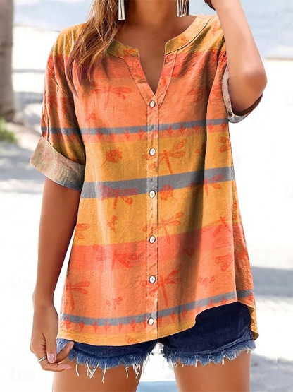 Women's Dragonfly Art Print Short Sleeve Cotton and Linen Shirt